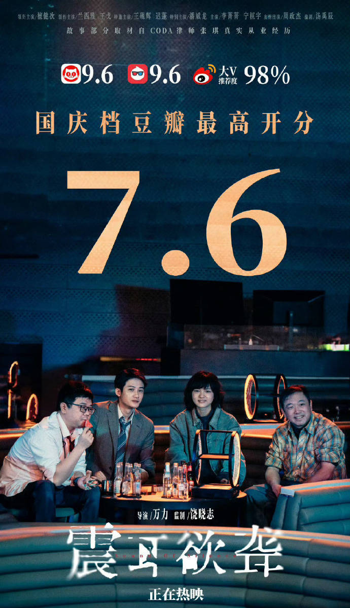 檀健次主演的电影《震耳欲聋》,豆瓣开分7.6,是今年国庆档最高分,同时也是今年国产真人电影豆瓣开分第四高,仅次于《戏台》《捕风追影》《南京照相馆》,也是国庆档所有电影评分人数最多的。截止到2025年10月12日下午,《震耳欲聋》的票房突破2亿,算是一匹黑马。